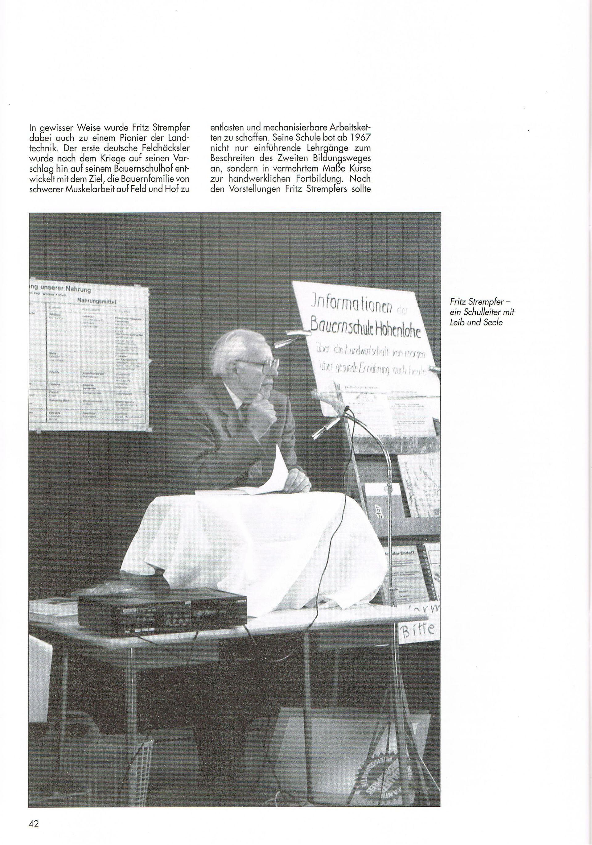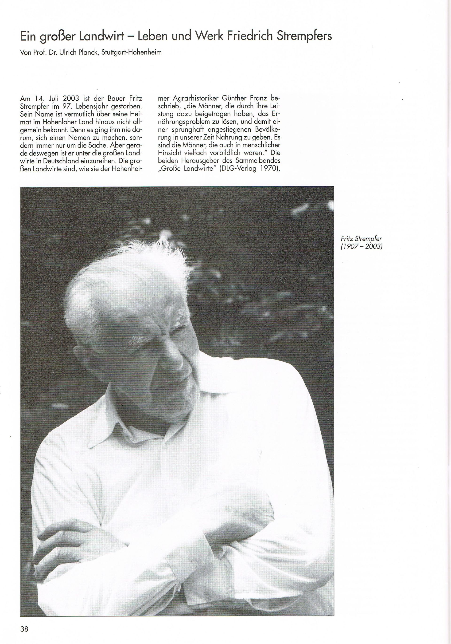 Am 14. Juli 2003 ist der Bauer Fritz Strempfer im 97. Lebensjahr gestorben. Sein Name ist vermutlich über seine Heimat im Hohenloher Land hinaus nicht allgemein bekannt. Denn es ging ihm nie darum, sich einen Namen zu machen, sondern immer nur um die Sache. Aber gerade deswegen ist er unter die großen Landwirte in Deutschland einzureihen. Die großen Landwirte sind, wie sie der Hohenheimer Agrarhistoriker Günther Franz beschrieb, „die Männer, die durch ihre Leistung dazu beigetragen haben, das Ernährungsproblem zu lösen, und damit einer sprunghaft angestiegenen Bevölkerung in unserer Zeit Nahrung zu geben. Es sind die Männer, die auch in menschlicher Hinsicht vielfach vorbildlich waren.“ Die beiden Herausgeber des Sammelbandes „Große Landwirte“ (DLG-Verlag 1970).