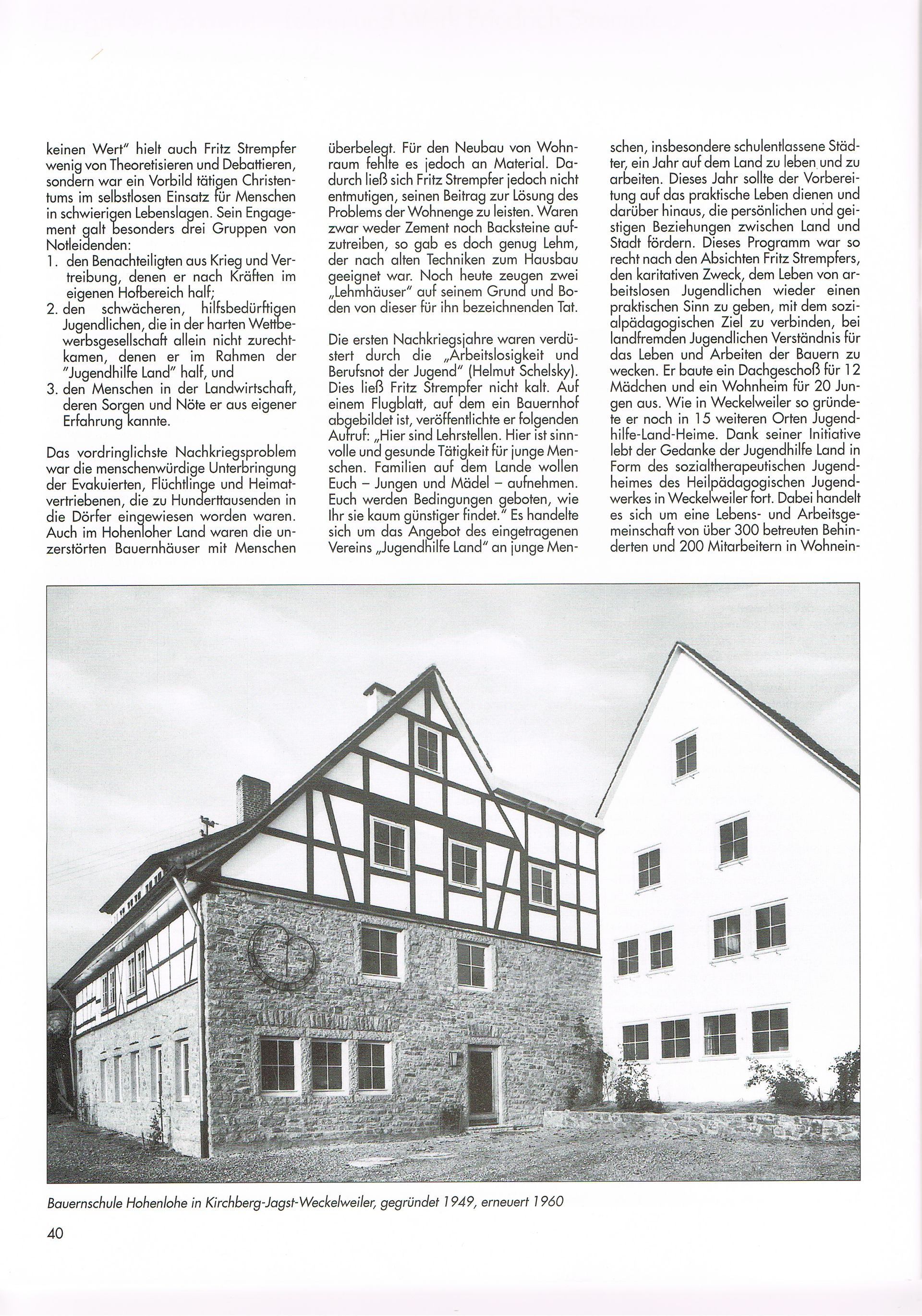 Fritz Strempfer teilte diese zögerliche Haltung jedoch nicht. Herausgewachsen aus seiner Landjugendarbeit im Kreise Crailsheim wurden allmählich aus Eintags- und Wochenendtagungen zunächst Kurse von einwöchiger Dauer. Im Jahre 1949 lud er im Auftrag des Bauernverbandes Burschen und Mädels zu einem Bauernschulkurs Hohenlohe vom 18. November bis 19. Dezember nach Kirchberg an der Jagst, dem ehemaligen Residenzstädtchen unweit von Weckelweiler, ein; im Januar 1950 folgte schon ein zweiter und im Spätherbst 1950 ein dritter Kurs. Untergebracht war die Schule vorübergehend in den Räumen der Jugendecke im Kirchberger Schloss. Unter großen persönlichen Opfern hat Fritz Strempfer in den Folgejahren einen Teil seiner Wirtschaftsgebäude umgebaut, um seiner Bauernschule ein eigenes Heim bieten zu können. Im Jahre 1960 konnten in Weckelweiler die eigenen Räumlichkeiten bezogen werden mit einer Kapazität von 50 Betten, zwei Lehrsälen und einem Arbeitsraum. Das Jahresprogramm umfasste einen Bauernschulvollkurs, eine Altschülerfreizeit, 30 Hof- und Dorfabende, sechs Wochenendfreizeiten und eine Lehr- und Studienfahrt.