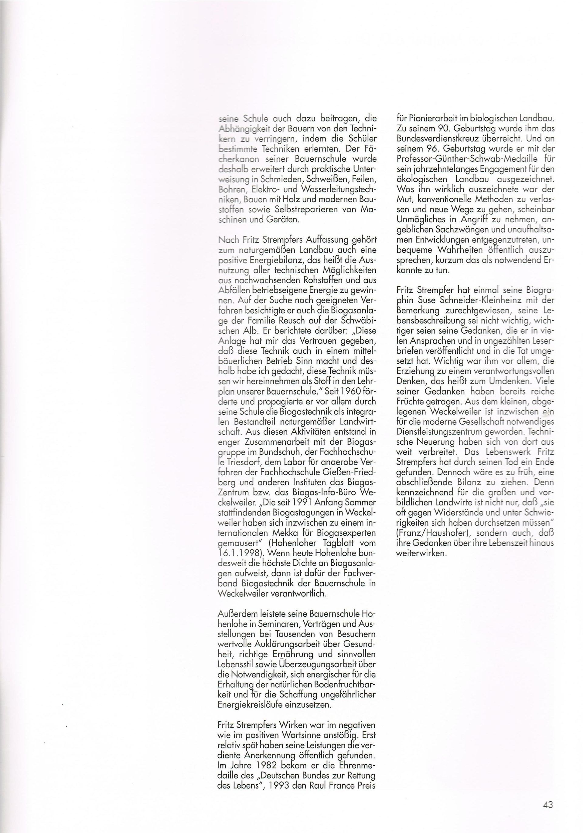 Nach Fritz Strempfers Auffassung gehört zum naturgemäßen Landbau auch eine positive Energiebilanz, das heißt die Ausnutzung aller technischen Möglichkeiten, aus nachwachsenden Rohstoffen und aus Abfällen betriebseigene Energie zu gewinnen. Auf der Suche nach geeigneten Verfahren besichtigte er auch die Biogasanlage der Familie Reusch auf der Schwäbischen Alb. Er berichtete darüber: „Diese Anlage hat mir das Vertrauen gegeben, dass diese Technik auch in einem mittelbäuerlichen Betrieb Sinn macht, und deshalb habe ich gedacht, diese Technik müssen wir hereinnehmen als Stoff in den Lehrplan unserer Bauernschule.“ Seit 1960 förderte und propagierte er vor allem durch seine Schule die Biogastechnik als integralen Bestandteil naturgemäßer Landwirtschaft. Aus diesen Aktivitäten entstand in enger Zusammenarbeit mit der Biogasgruppe im Bundschuh, der Fachhochschule Triesdorf, dem Labor für anaerobe Verfahren der Fachhochschule Gießen-Friedberg und anderen Instituten das Biogas-Zentrum bzw. das Biogas-Info-Büro Weckelweiler. Die seit 1991 Anfang Sommer stattfindenden Biogastagungen in Weckelweiler haben sich zu einem internationalen Mekka für Biogasexperten gemausert“ (Hohenloher Tagblatt vom 16.1.1998). Wenn heute Hohenlohe bundesweit die höchste Dichte an Biogasanlagen aufweist, dann ist dafür der Fachverband Biogastechnik der Bauernschule in Weckelweiler verantwortlich.